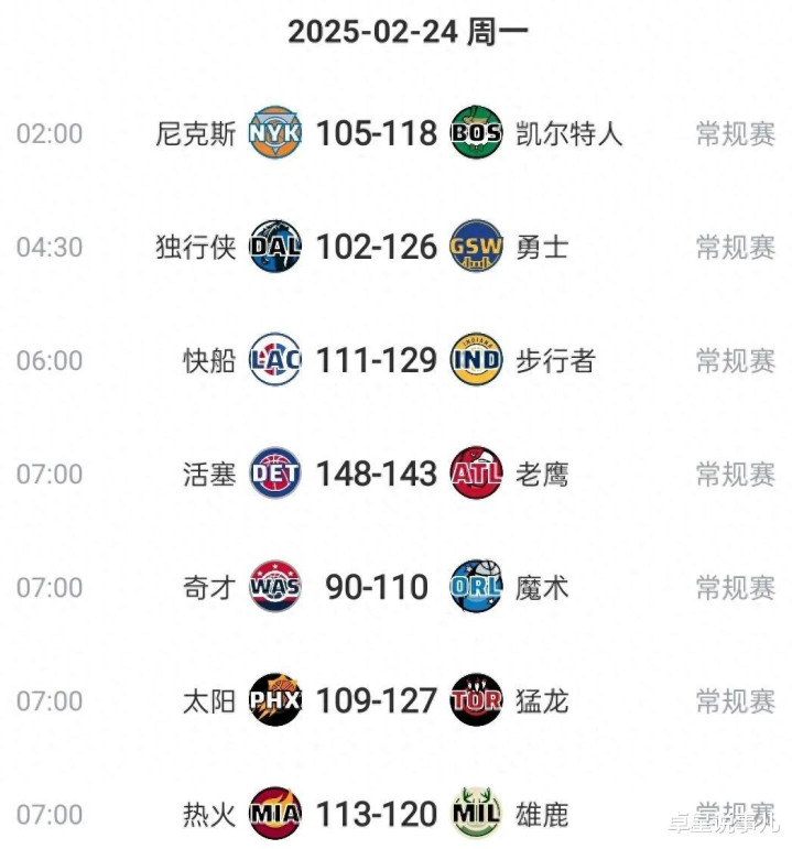 其他比赛结果及排名变化: 除了太阳队和勇士队的比赛外,2月24日的NBA赛场上还上演了多场精彩对决。 纽约尼克斯队以105:118不敌波士顿凯尔特人队;洛杉矶快船队以111:119负于印第安纳步行者队,遭遇两连败,排名西部第六,仅领先明尼苏达森林狼队0.5个胜场;底特律活塞队以148:143击败亚特兰大老鹰队;华盛顿奇才队以90:110不敌奥兰多魔术队;迈阿密热火队以113:120不敌密尔沃基雄鹿队。 这些比赛结果进一步加剧了西部季后赛的竞争激烈程度,各支球队都面临着巨大的压力。